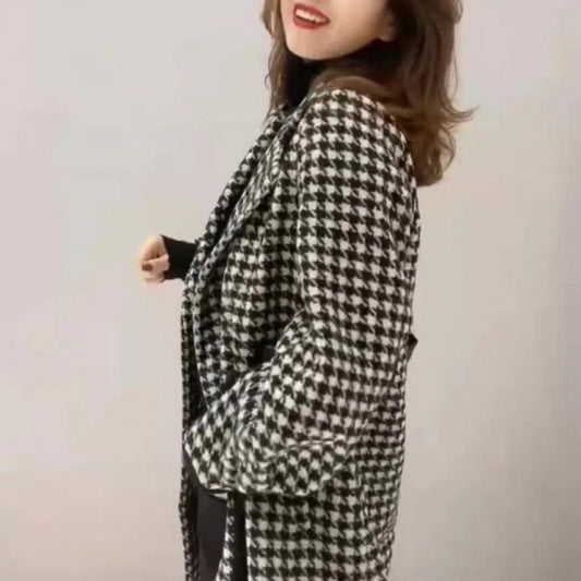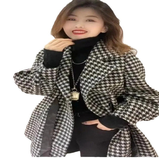 Color Effect Collar Hollow High-grade Houndstooth Patchwork Ruffled Waist-tight Autumn And Winter Long Sleeve Retro Dress